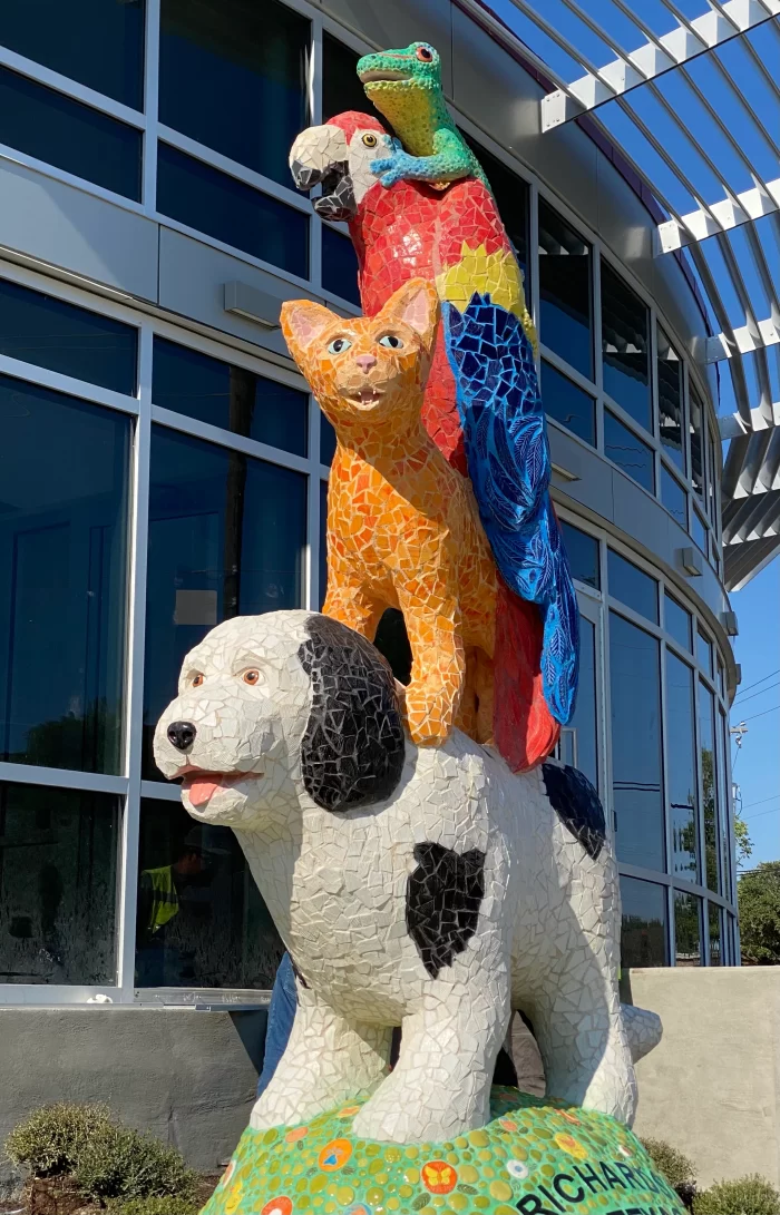 By the time visitors reach the front door of the Richardson Animal Shelter—whether to drop off donations, adopt a pet, or volunteer—they are greeted by an unofficial welcome committee: a playful tower of colorful animals crafted in vibrant mosaic tile. These figures shimmer with ceramic textures, jewel-like colors, and whimsical expressions. This cheerful sculpture, titled “The Town Musicians of Richardson,” references the Brothers Grimm fairy tale, “The Town Musicians of Bremen.” In the tale, abandoned animals’ band together, leaving their old lives behind for a new future—a perfect parallel for a city animal shelter, where unwanted pets arrive uncertain and leave with new families and new beginnings. A Welcoming Emblem for a New Chapter The installation is part of the shelter’s 2025 renovation, which includes a new façade and a more inviting entrance. Commissioned through the City’s Public Art Master Plan, the sculpture reinforces the idea that municipal services can be places of care, hope, and personal connection. Community Hands in the Clay Although artist Gigi Griffin Miller designs and builds her sculptures herself, she intentionally invites local involvement. For the Richardson installation, she hosted a community tile-making event for volunteers, fosters, and shelter staff. Every piece crafted by residents was later fired and installed into the base of the sculpture. The entire piece is made of ceramic mosaic tiles that Miller crafts by hand. Memorial tiles, pet prints of fostered animals, and the names of beloved pets are forever memorialized in the sculpture. Miller chose to make the base’s decorative “flowers” the site of these meaningful additions. “That’s where all the memories are,” she explains, literally forming the foundation for the animals above. Built With Purpose, Built to Last Miller’s work is known for durability as well as sentiment. Her mosaic “The Fish” in Kerrville, Texas, famously survived catastrophic flooding, becoming a local symbol of resilience and hope. The scale of “The Town Musicians of Richardson” presented a unique construction challenge, forcing Miller to work outdoors in the Texas heat for months. She insisted on the size—something large enough and colorful enough to catch the eye of drivers, drawing them toward “the real treasures,” the adoptable pets inside. Public Art and Creative Placemaking Miller’s artistic practice is rooted in community development and what she calls “creative placemaking.” She firmly believes civic involvement fosters inclusion and personal investment in shared spaces. Her philosophy centers on the idea that public art should feel like it belongs to the people who encounter it every day. As she puts it: “There’s something magical about art that is community-made. It transcends the individual tiles and creates a sense of place. A community work of art can be a place to return to and serve as a reminder that I existed here in this special place and time.” Miller concludes that “Art is transformative,” especially when it lives where everyday life happens: outside a shelter door, near kennels and adoption rooms, next to the open-hearted families deciding to give an animal a home. Want to read more stories like this? Visit Richardson Life Magazine.